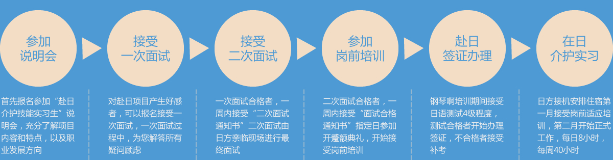 参加岗前培训认真学习的学员,保障获得日本优良养老企业的就业机会。办理赴日签证和往返机票,赴日工作期间3年~5年